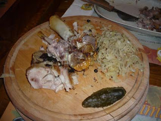 Lo presentan sobre una capa de ensalada de col (...), y acompañado de pepinillos y patatas asadas. Los pepinillos también están en muchos platos. Y las salsas nunca faltan. Esta vez había de dos tipos, una era mostaza bastante fuerte y la otra, blanca, alguna raíz de no se que...muy fuerte también.